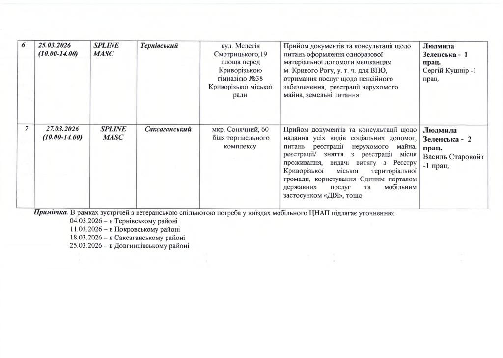 З метою наближення адміністративних, інших публічних послуг, вирішення актуальних запитів криворіжців та громадян України, які переселилися до м. Кривого Рогу у зв’язку з військовою агресією російської федерації проти України у березні 2026 року плануються виїзди Мобільного ЦНАП «Віза» («Центр Дії»).